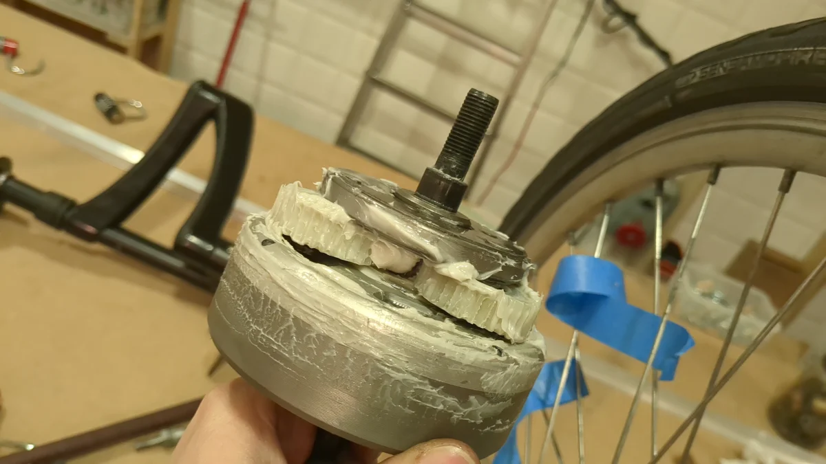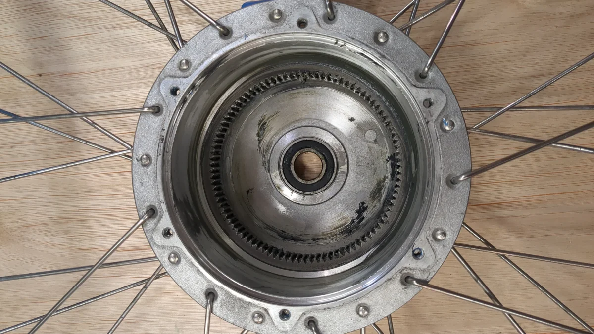 We had this ebike_motor that was donated to the repair cafe, that no longer worked and the person involved didn’t want it back as they had an upgrade and had been told it was unfixable. Bit of diagnosing later, as I could get the motor to spin with the throttle, but the wheel itself would stop and start and stutter, which didn’t make much sense. I knew that the battery was fine as I could test the voltage on that, and as it’s a brushless motor and controller, it didn’t make much sense why the wheel would stop/start/stop, so seemed more of a mechanical issue. So I removed the whole motor connectors and opened the housing for the in-wheel motor. Inside the housing was a disgusting mix of black grease, along with the remains of the nylon planetary gears that had been absolutely shredded to the extent that they were basically smooth around 2/3 of the gear face! This made sense why the wheel would spin for a little bit and then stop! When I was re-assembling the motor housing I found out why the gears had shredded themselves to bits however! The bearings for the motor were totally seized and would not budge in the slightest!! So the motor and gearbox would have been straining against seized bearings which would allow a bit of movement and then stop, which is most likely why the gears got shredded. Bought a bunch of new bearings and pressed those in happily. Then I had to source a replacement planetary gear set and re-grease it and assemble which all was possible and found the exact match of nylon pair and flooded the gearbox with a bunch of high temp grease and it works like a dream. I still get messages from the person who eventually got it who is very happy with it and has no issues
