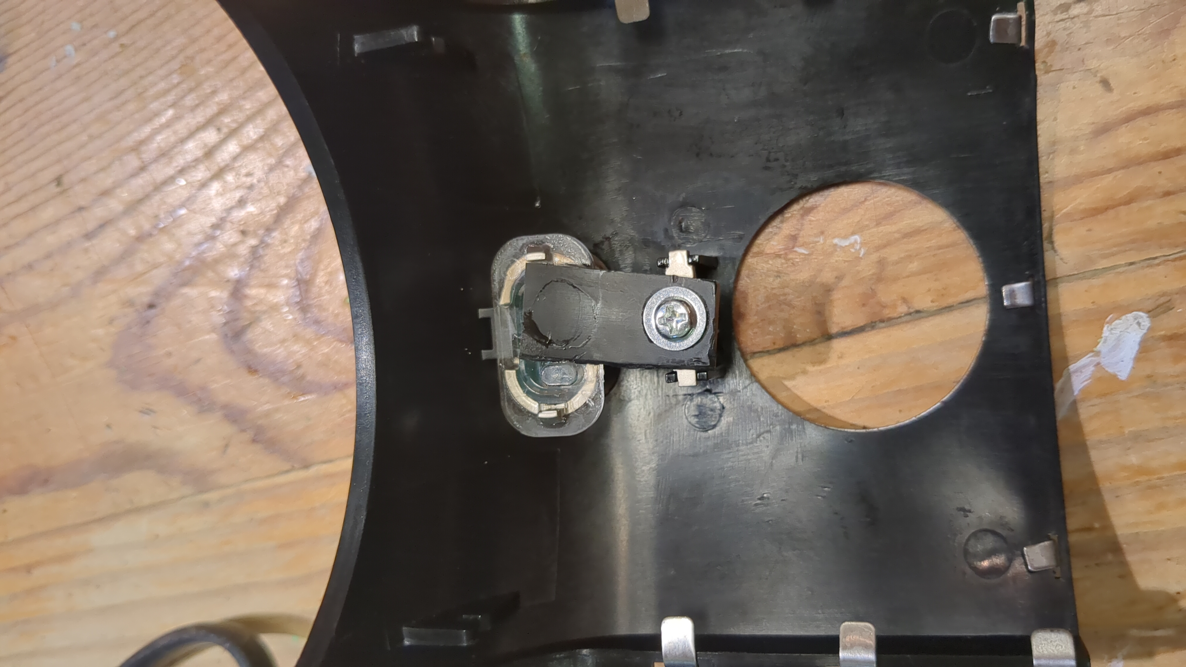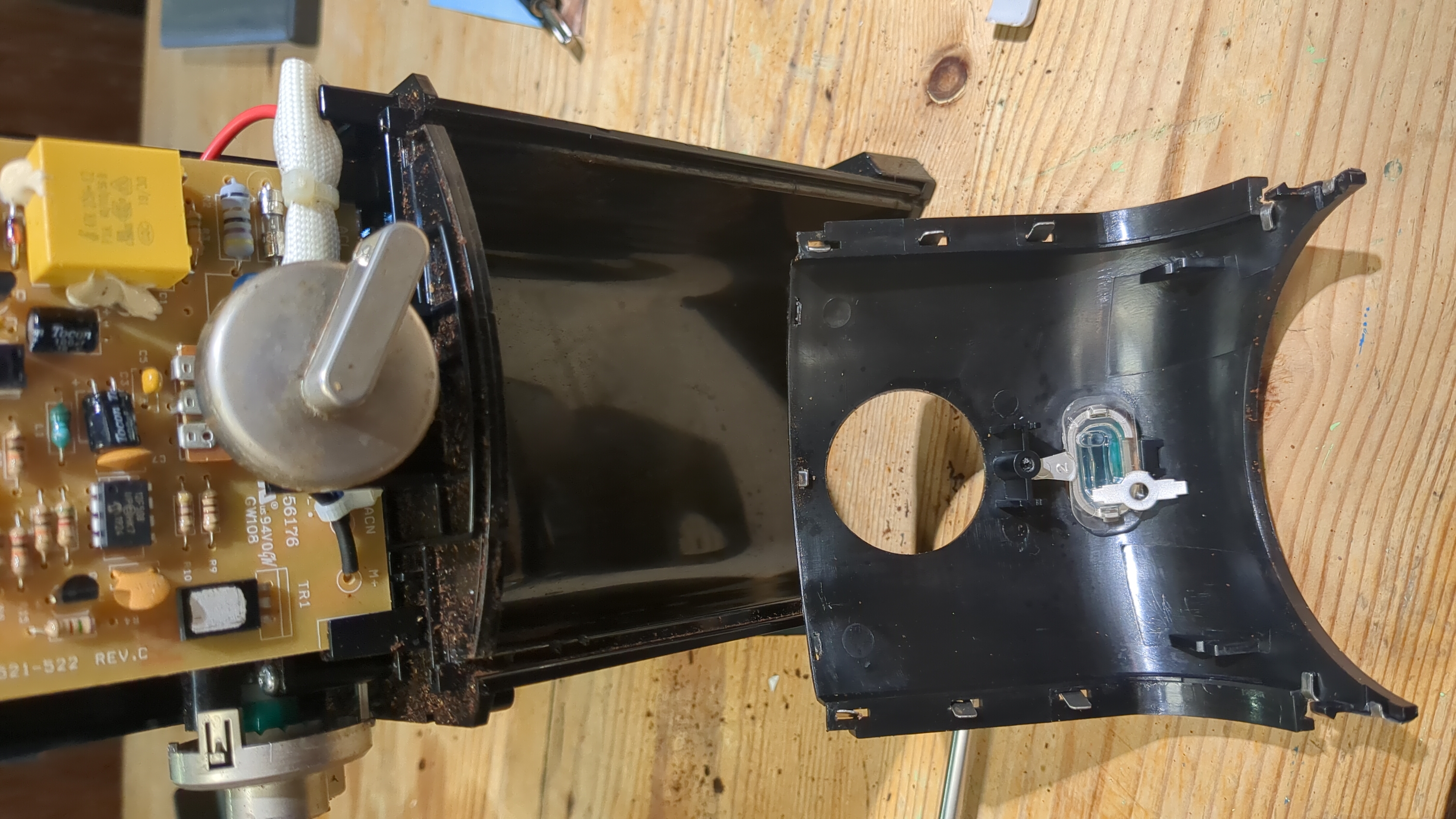 This was something found in the recycling bin that I thought we could use. A DC powered magnifier and light. Opening it up revealed an absolutely catastrophic death of some poor transistor that had turned to DUST!. I removed the board as it had cracked in half as well. Replaced the circuit with something on stripboard to have an adjustable current source to drive the LEDs. It is now used in our cafe to repair other things!