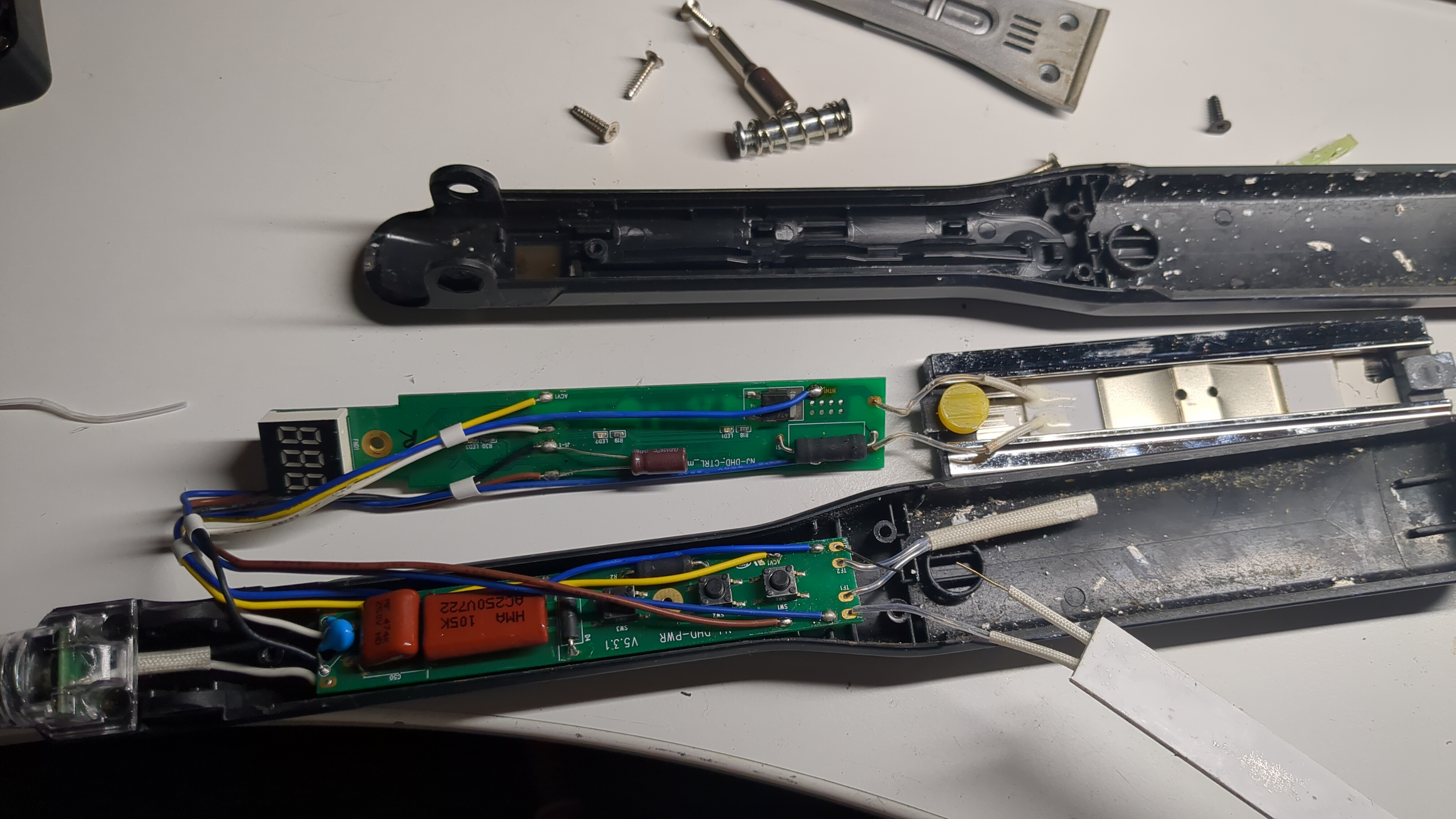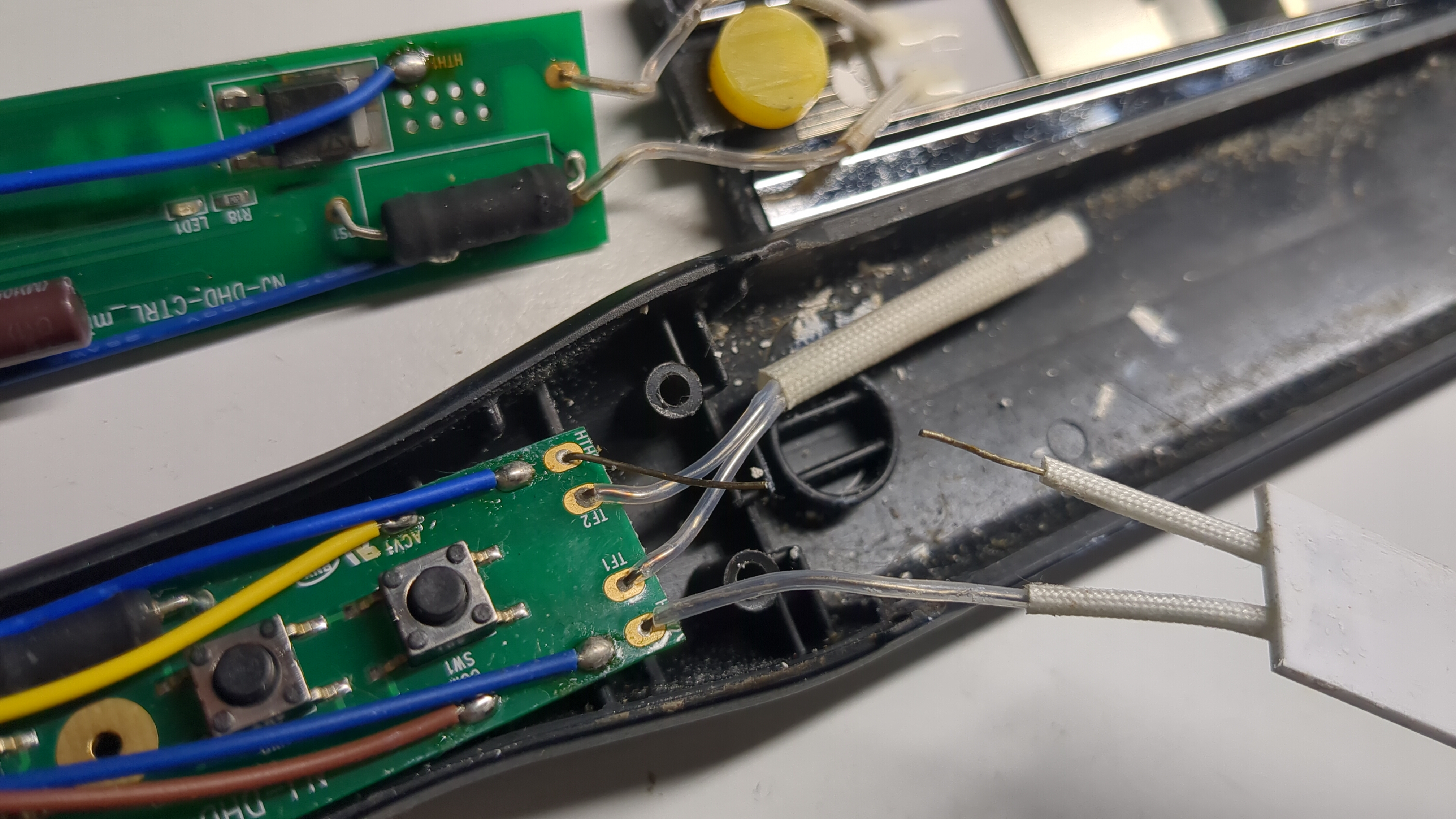 Customer brought this in, and she had the issue that when you would turn it on and use it, they would suddenly turn off! Opened them up and found that one of the main power connections to the heating element had snapped due to movement. Re-solder it and crimp it down and it works happily. One interesting note about these straighteners is that they do not have a sensor feedback to detect temperature that I could spot, so they must work on calibrated heat elements and some form of current control with a known power loss. Quite clever design inside too.