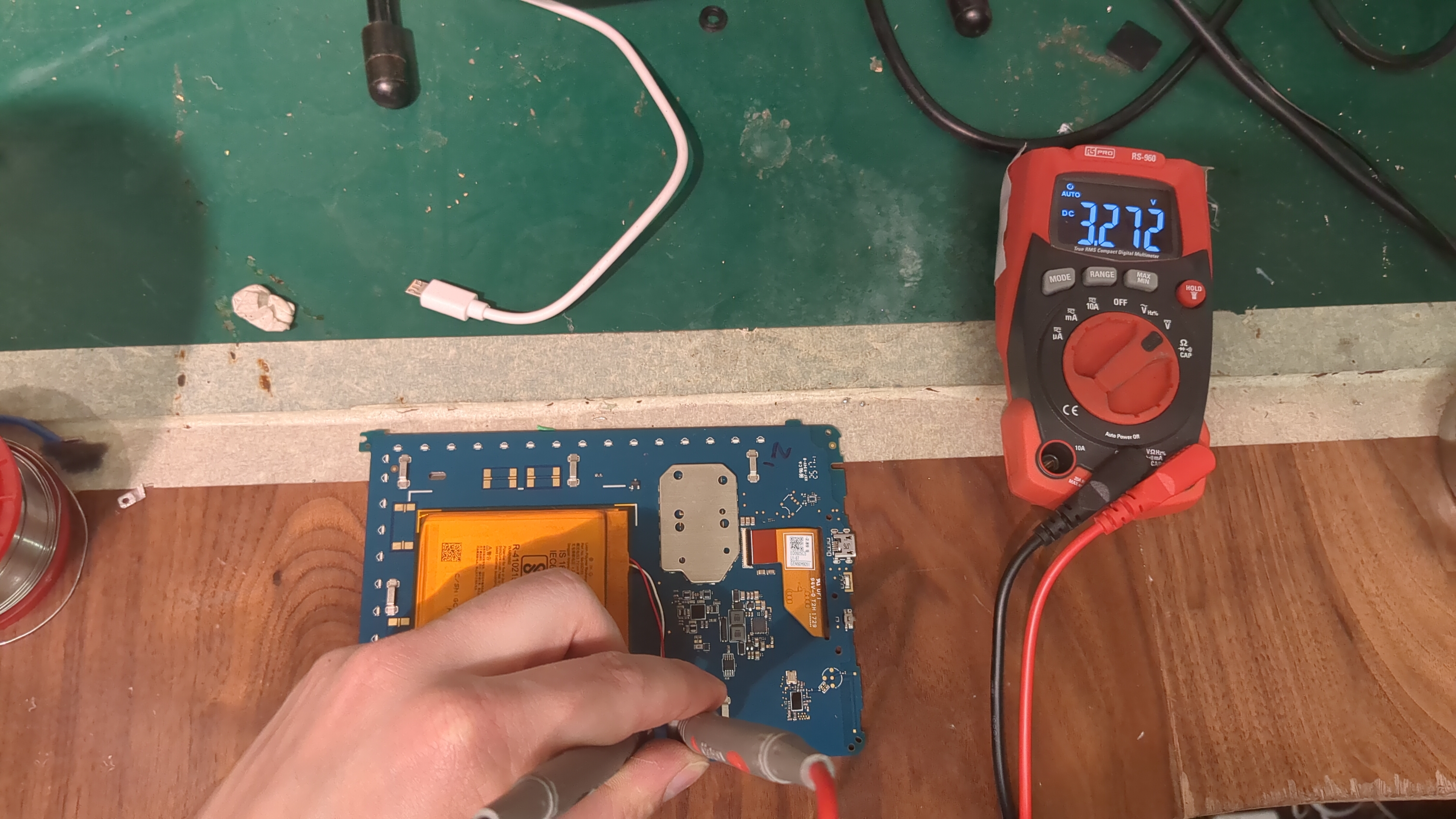 Customer brought in this Kindle that was stuck on the last page she read, and wouldn't charge at all. Opened it and measured the battery voltage which should have been 4.2V, when charging it would tick up but the second you removed the charging port the voltage would instantly drop back down. It is possible to buy replacement batteries for Kindles, but Amazon also runs a scheme where you can trade in kindles for vouchers and money off a new kindle so that's what the customer did, as it was an old model anyway.
