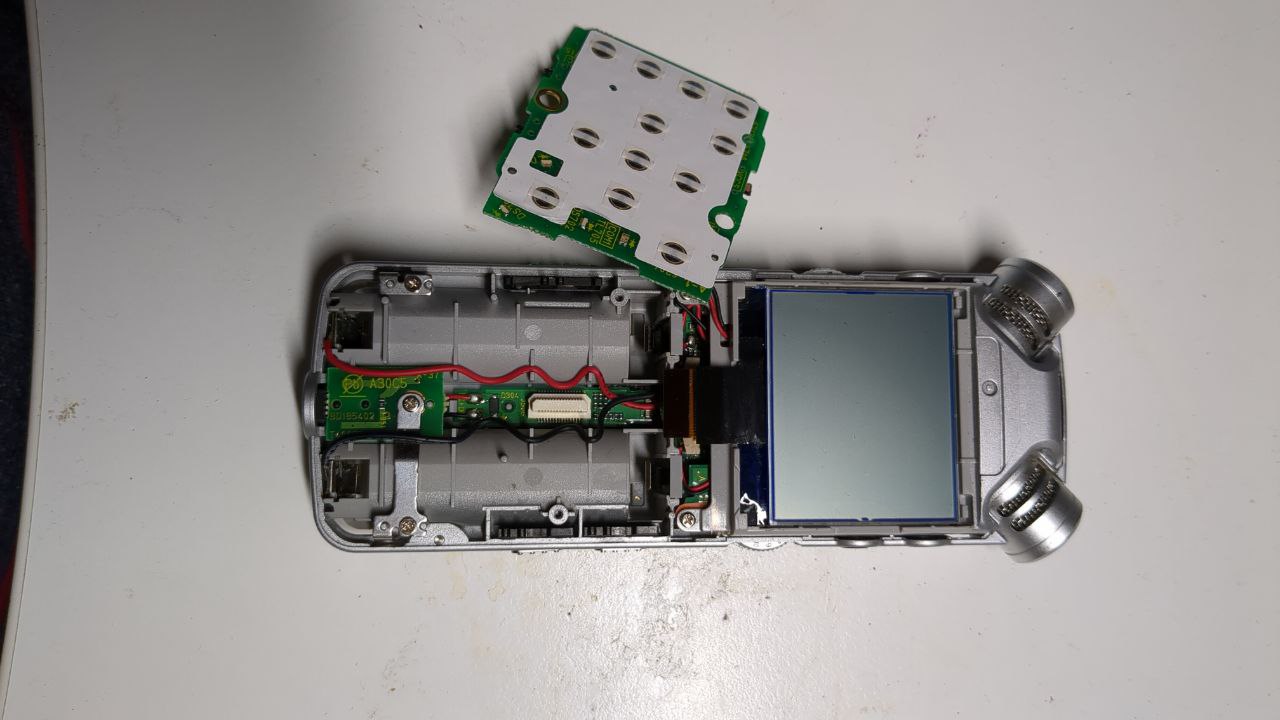 Device works fine in terms of recording audio and turning on, but there are a series of lines on the screen that don’t disappear and never turn on. Open it up, and the ribbon cable connection from the screen to the mainboard was old and slightly corroded and making a bad connection. Used a bit of switch cleaner and a Q-Tip to clean up the connector and the issue disappeared!